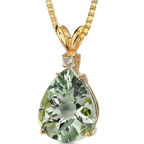 Gemstones: Genuine Green Amethyst, Pear Shape, 16x13mm, 7.50 carats. Green Amethyst is top Gem quality with Intense Color and Brilliance. 1 pieces Sparkling Diamonds total weight of 0.03 carats accent the pendant. Retails for $349.99. Pendant weighs 1.85 grams. Pendant's dimension is 1/2 x 1 inches. Pendant is in 14 Karat pure gold and bears the 14kt stamp. Includes Gift Box and Free Shipping. Chain is not included. Sku# P8326